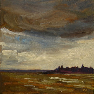 This has been such a busy year and after I finished my 30 paintings in 30 days project I seemed to have let the 6x6" paintings lapse. Other commitments prevailed, but two weeks ago when I went to Waskesiu Lake for a bit of quiet time and to help clean-up the cabin for the winter, I did some plein air painting. I ended up with 5 new little paintings and this was one of my favorites. I love the colours- quite different from my other skies. It is simple, but dramatic. Our skies this summer have been tricky for a painter... especially plein air. Why, you ask? Well it seems they were either bright blue skies with not a cloud to be seen, or they were tornado-watch kind of skies which are usually accompanied by a ridiculous level of wind. Either way not optimum for painting!