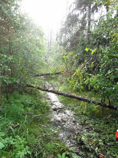 with soft, gentle drops, but by the time all of the bags and canoes were across the portage things started to get quite interesting. The lightening arrived in full force and was hitting trees around us... and I mean all around us... we could see smoke and ash rising after a strike and the thunder was incredibly loud! Our assistant guide advised us to spread out and make ourselves as small as possible. The rain came in sheets and we were pelted by pea-sized hail. I remember sitting under the bushes watching the surface of the lake swirl and dance with the wind-blown rain. Because we were on the sheltered side of the portage none of us had a grasp on just how powerful the wind was, that is until trees started falling.
